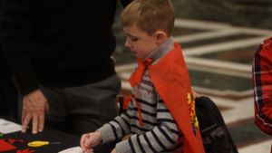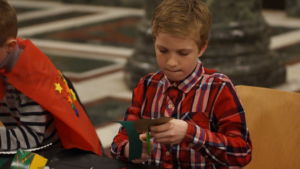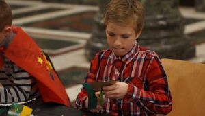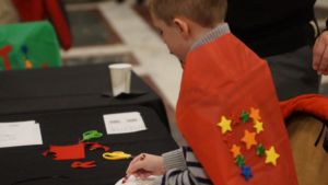 A student makes a cape at the Creativity Table before the TRYPO concert.