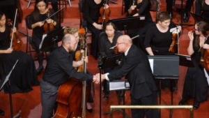 Music Director John Wilcox shakes the hand of soloist EQTeach coach Aaron White, who performed from the Koussevitzky Bass Concerto.