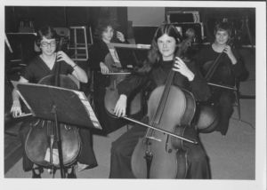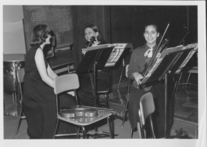 Winter Concert on January 18, 1978 at Duquesne University Recital Hall. Left to right, Becky Rothermel, Edith Mark and Laura Gild (violins).